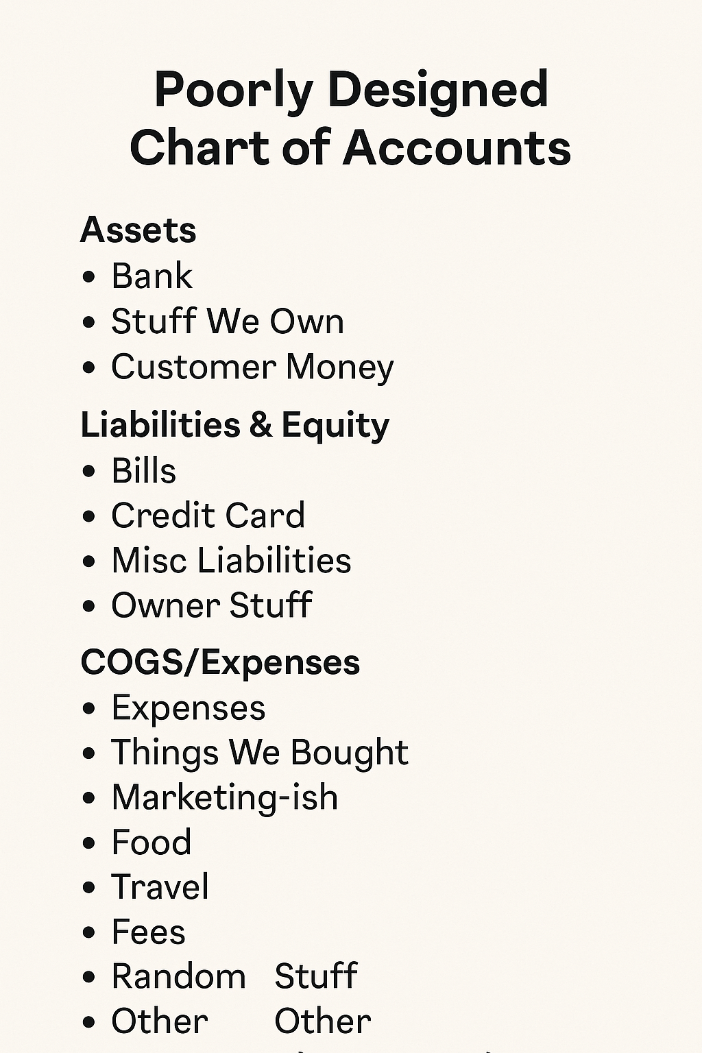 Let’s be honest—most small business COAs start out as a mess. Either someone winged it in QuickBooks, or it was copied from another business that has totally different needs. Here’s what happens when it goes off the rails: