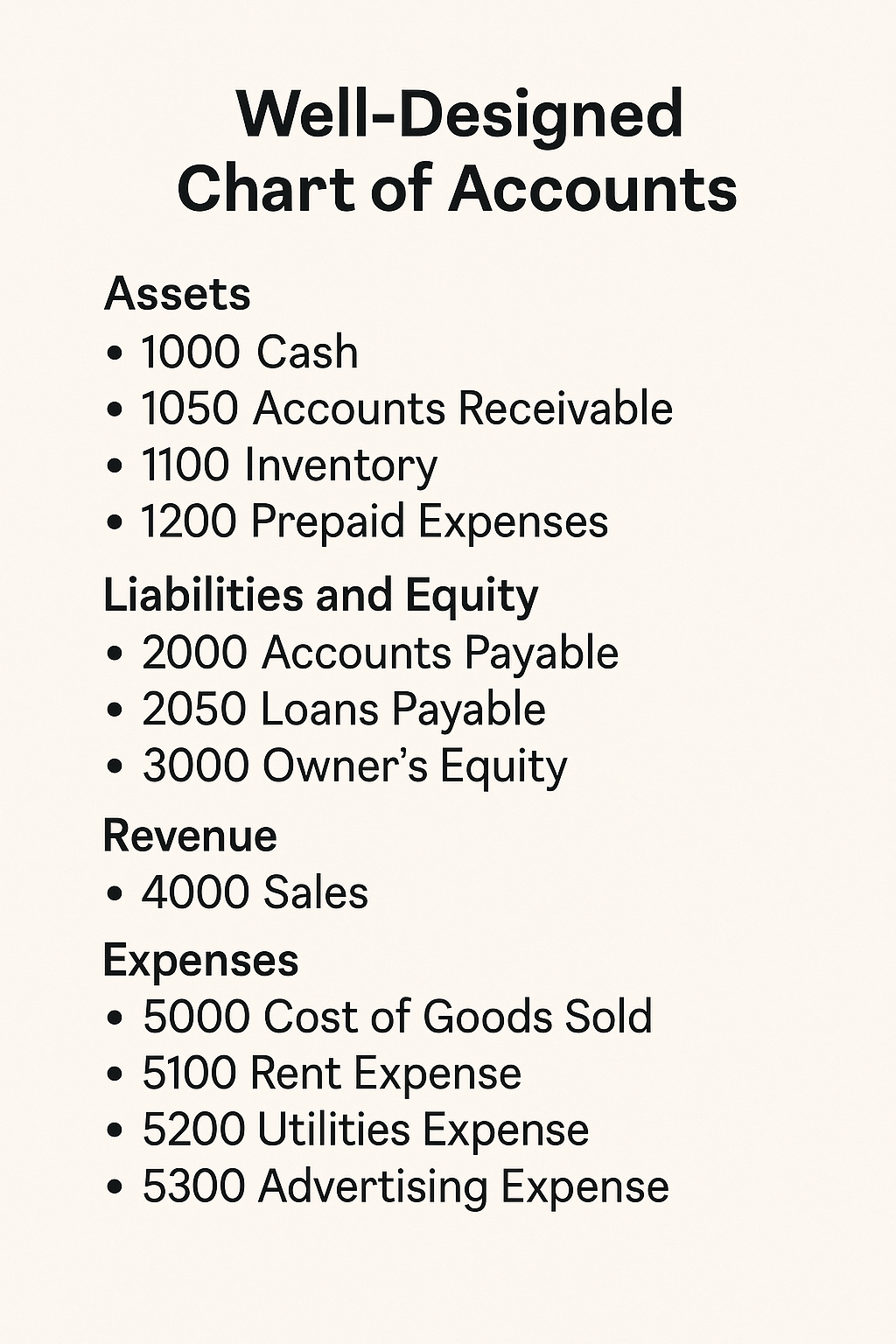 ✔️ Start with a custom-tailored chart of accounts that fits your business type, size, and goals—not a generic template.✔️ Keep it lean, but detailed where it counts. Don’t go overboard with 200 accounts you’ll never use. Focus on categories that help you make decisions.